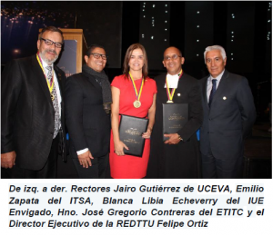 Entre aplausos los rectores Hno. José Gregorio Contreras del ETITC, Jairo Gutiérrez Obando de UCEVA, Oscar Orlando Porras de UNIPAZ, la rectora Blanca Libia Echeverry del IUE Envigado y el vicerrector administrativo Iván Darío Ortega del Politécnico Jaime Isaza Cadavid subieron al escenario para recibir de manos del Viceministro de Educación Superior Luis Fernando Pérez la Orden; es importante destacar que la IES ETITC recibió también la distinción “Andrés Bello” por medio de un estudiantes que obtuvo un excelente resultado en las Pruebas Saber. En la ceremonia de gala estuvieron presentes el Presidente del Consejo Directivo de rectores Emilio Zapata y el Director Ejecutivo de la REDTTU para acompañar a los rectores en la celebración.